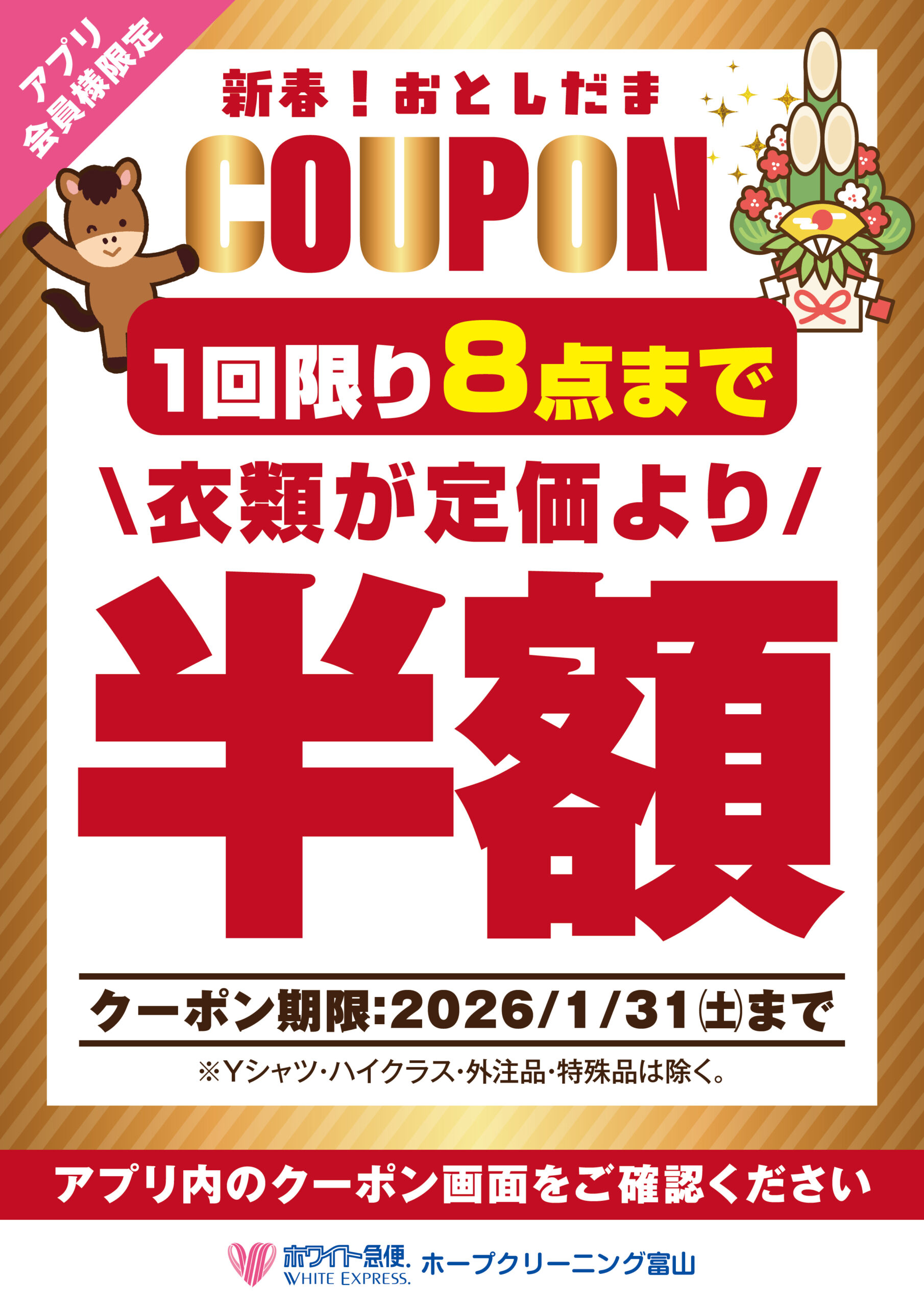 明けましておめでとうございます。 本年もよろしくお願いいたします。 日頃のご愛顧に感謝をこめて、アプリ会員様、ゴールド会員様へ「8点まで半額」の お年玉プレゼント!を開催いたします。 期間は1月5日から1月31日までとなります。